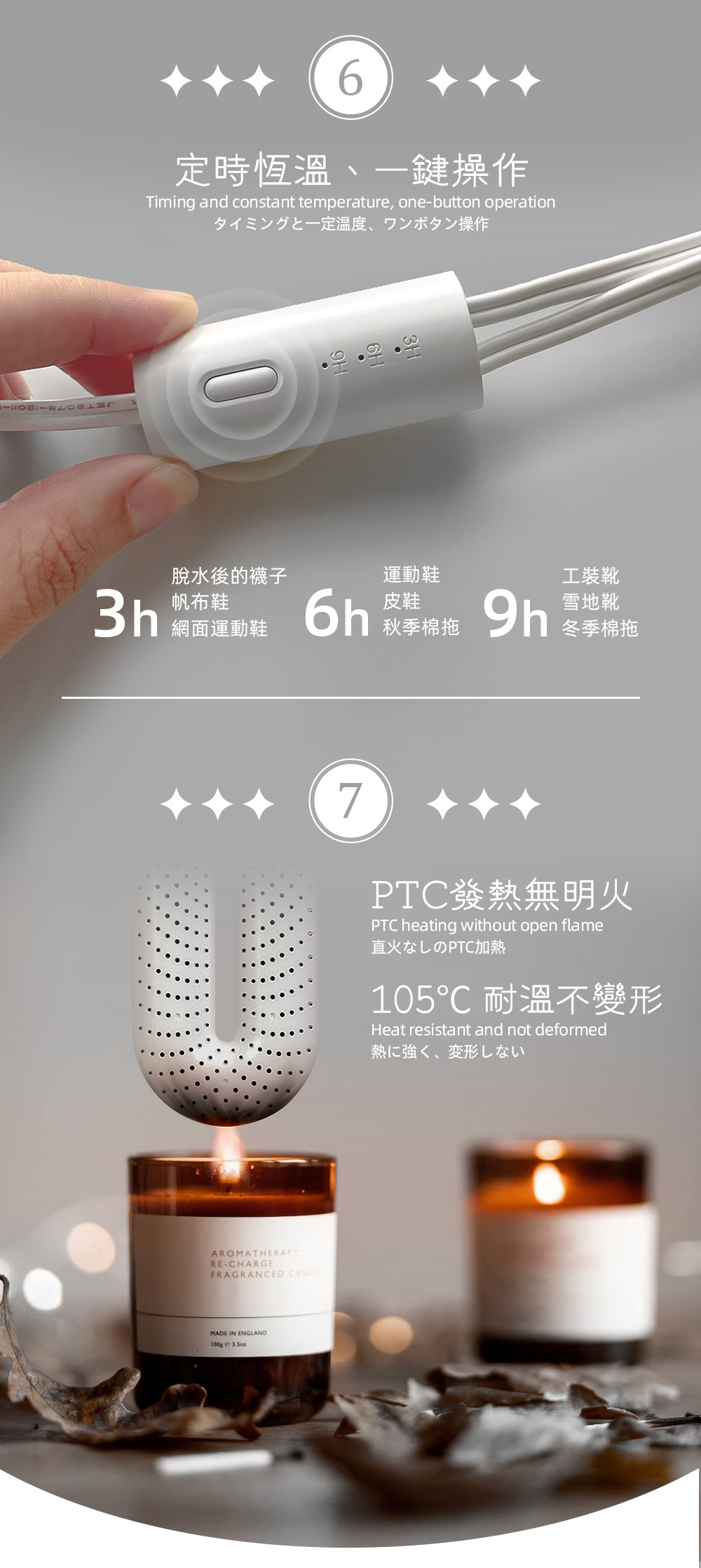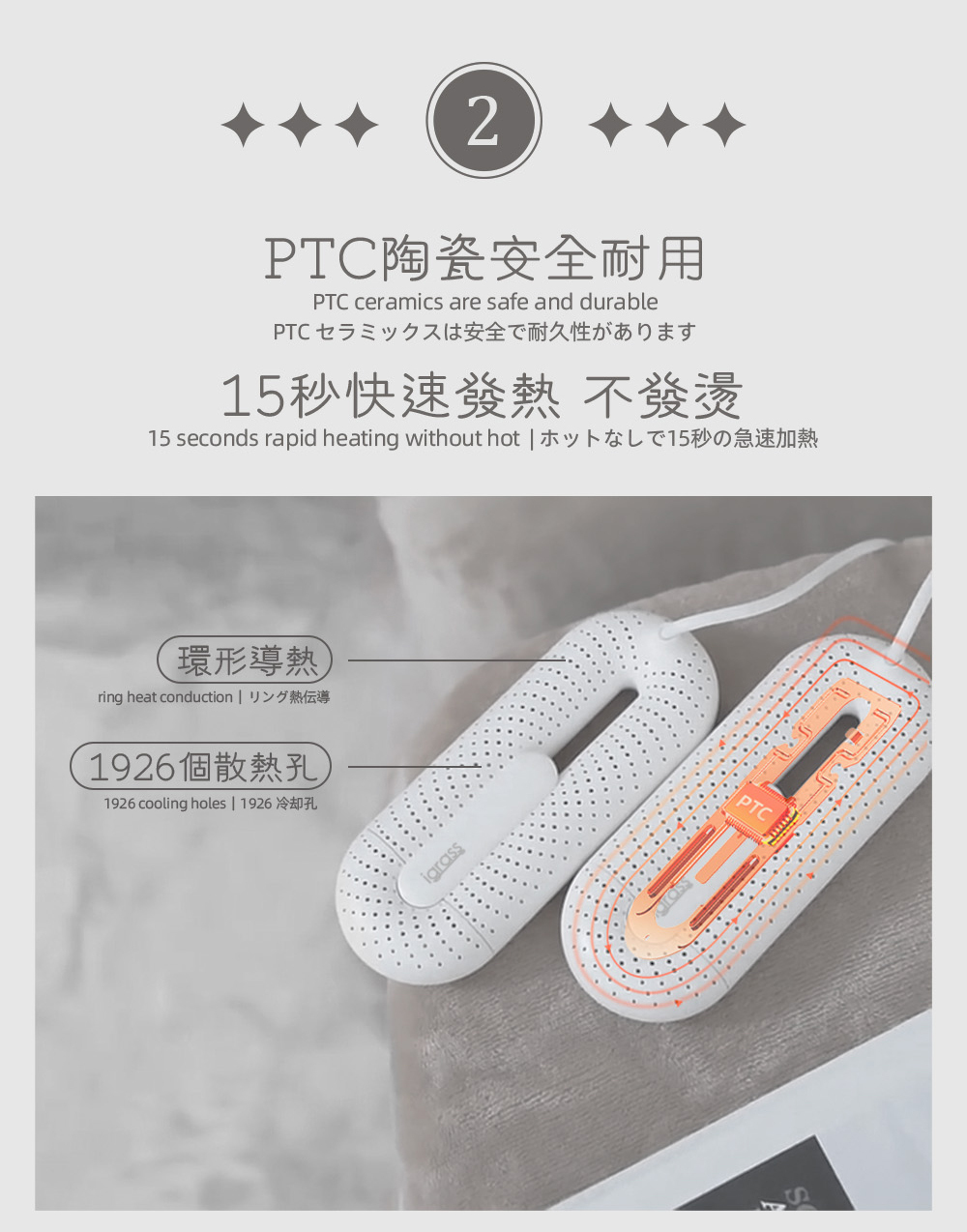 ● PTC雙芯加熱,均勻散發熱能