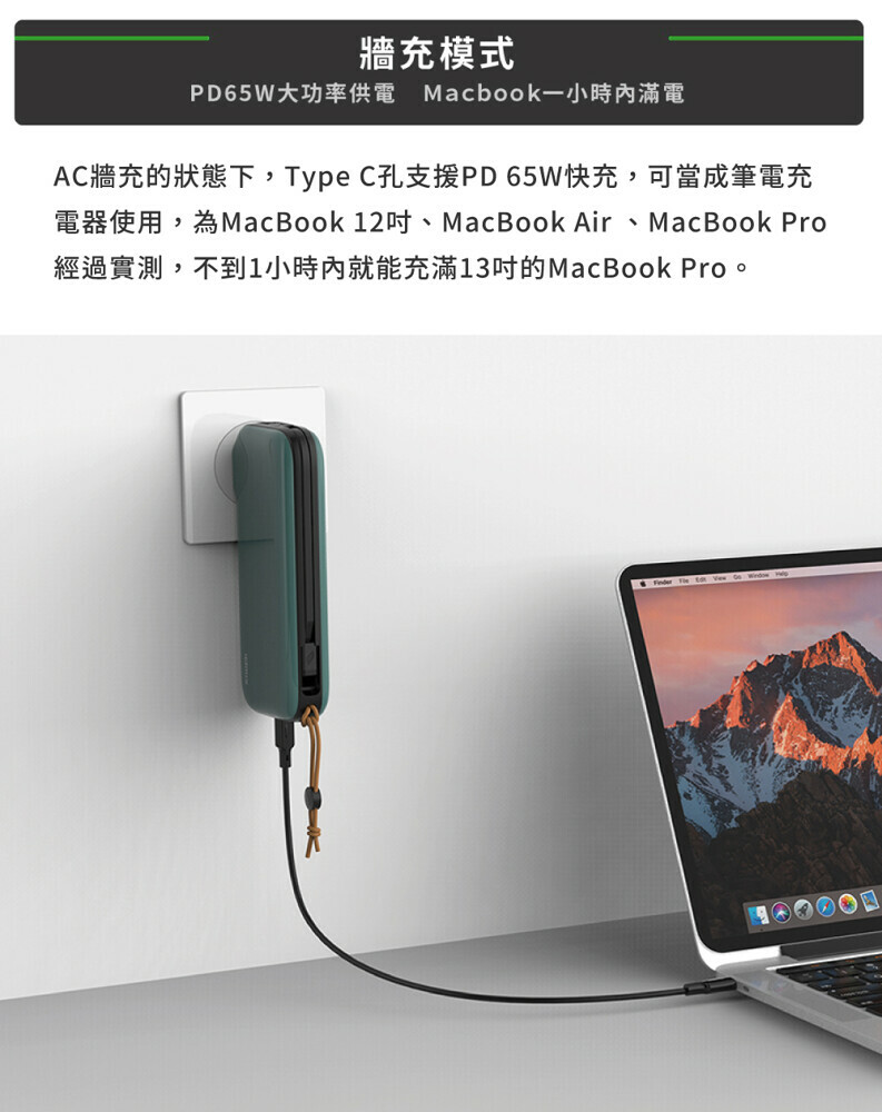 ● 插電模式 - 支援PD65W快充,可當成筆電充電器使用