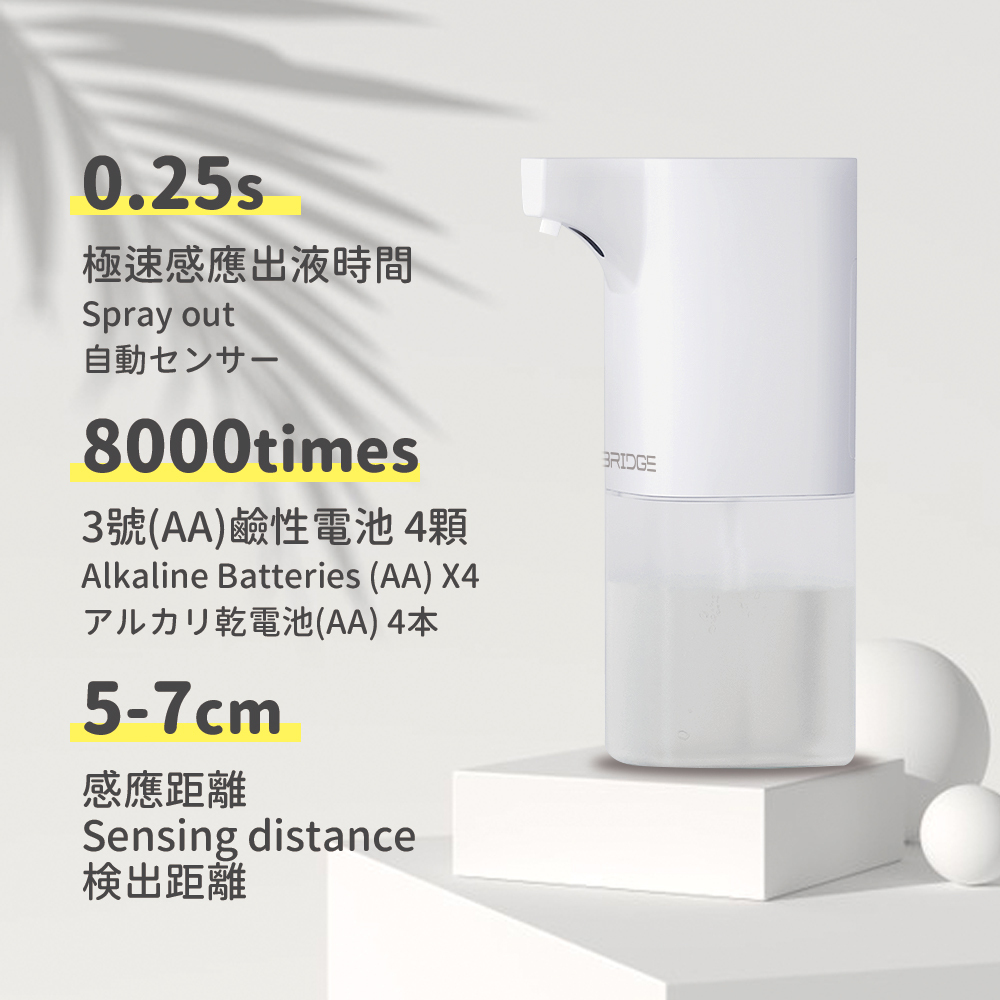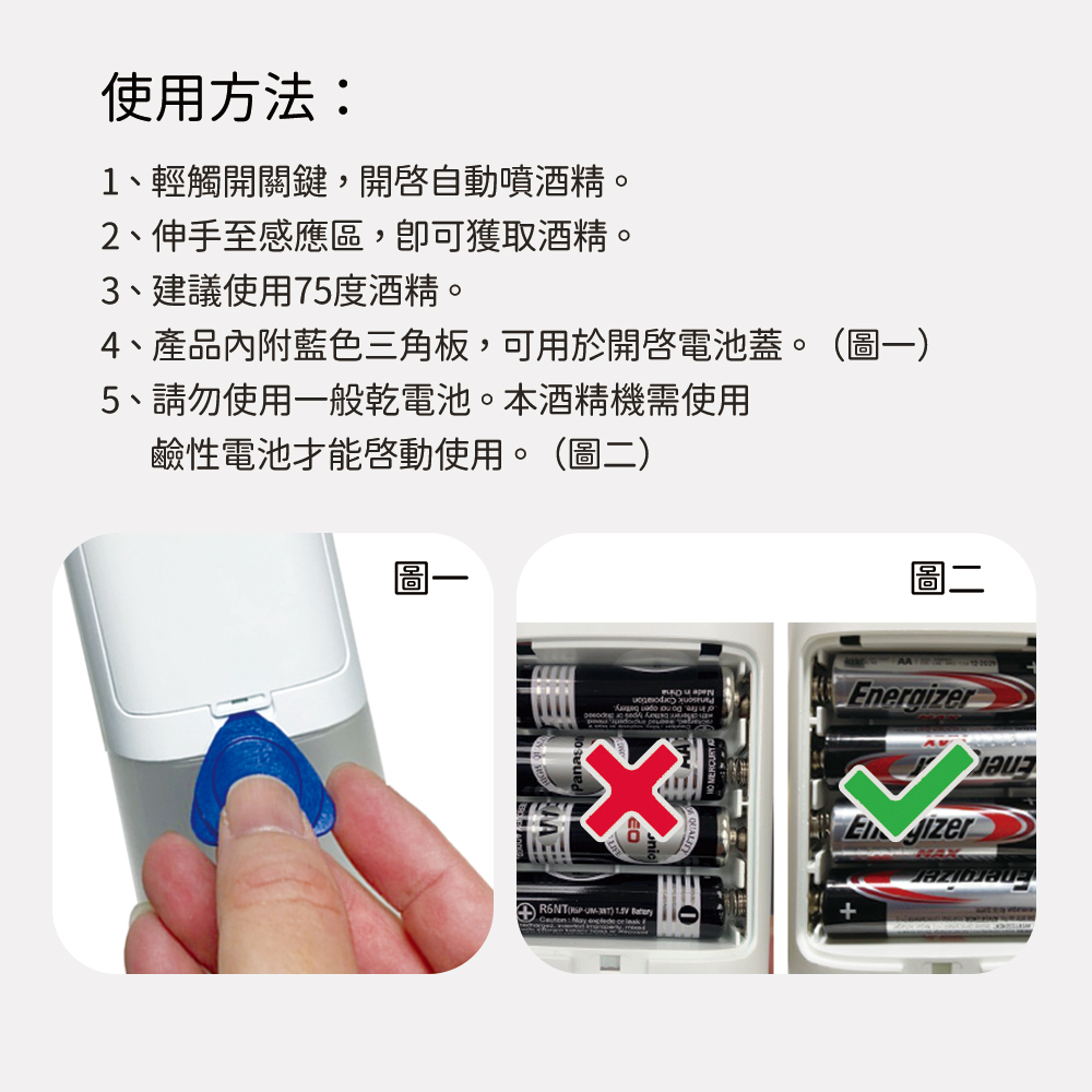 ● 使用四顆3號AA鹼性電池,續航力可達八千次噴霧
