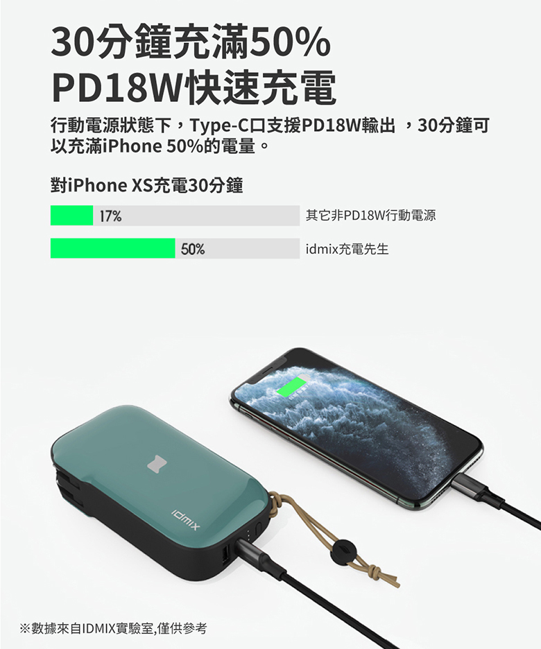 ● Type-C口支援PD18W輸出,約30分鐘可充飽iPhone 50%